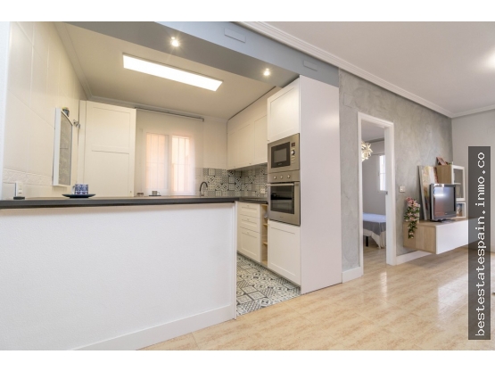 Completely renovated ground floor apartment located 200m from the sea in a private residential complex with pool in Cabo Roig. 69m2 apartment, consists of two bedrooms, one bathroom, spacious living room with aircondition, fully equipped open kitchen, terrace with direct access to the pool.
