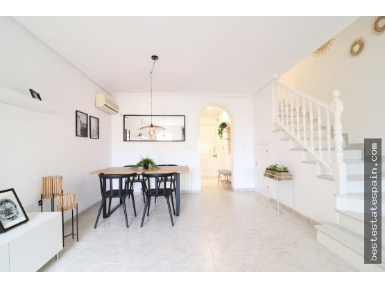 Campoamor Golf Course, 85 m2 Duplex Townhouse with 2 bedrooms, 2 bathrooms, independent kitchen with gallery, large living room, 2 terraces, 17 m2 solarium with sea views, front and rear garden, has 3 community pools, paddle and tennis, the house is sold furnished and with air conditioning.